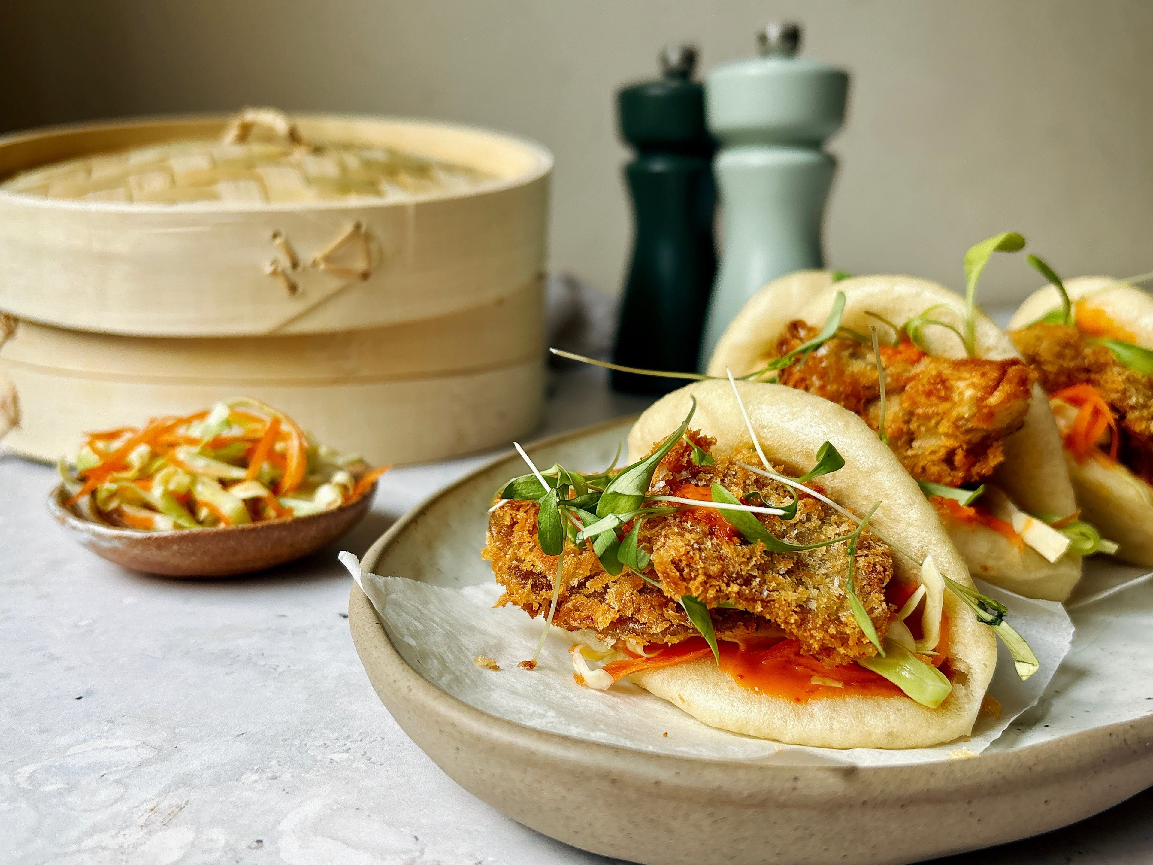 Time to assemble the bao buns. Open each warm bun and spread with vegan sriracha mayo. Add the pickled vegetables and the crispy mushrooms. Finish with a little more sauce and a few sprigs of fresh coriander.
